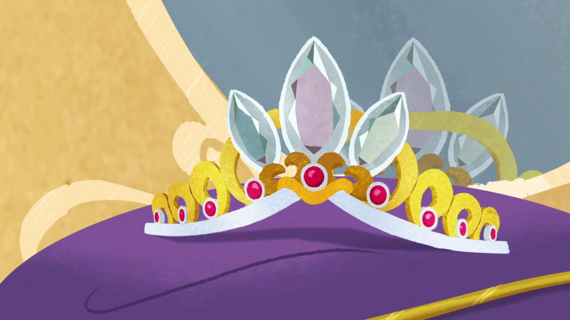 Rapunzel's Crown was given to Corona's newborn princess in the movie, Tangled. It’s a mostly gold tiara with a three tear-shaped diamonds with small rubies on the gold shapes.