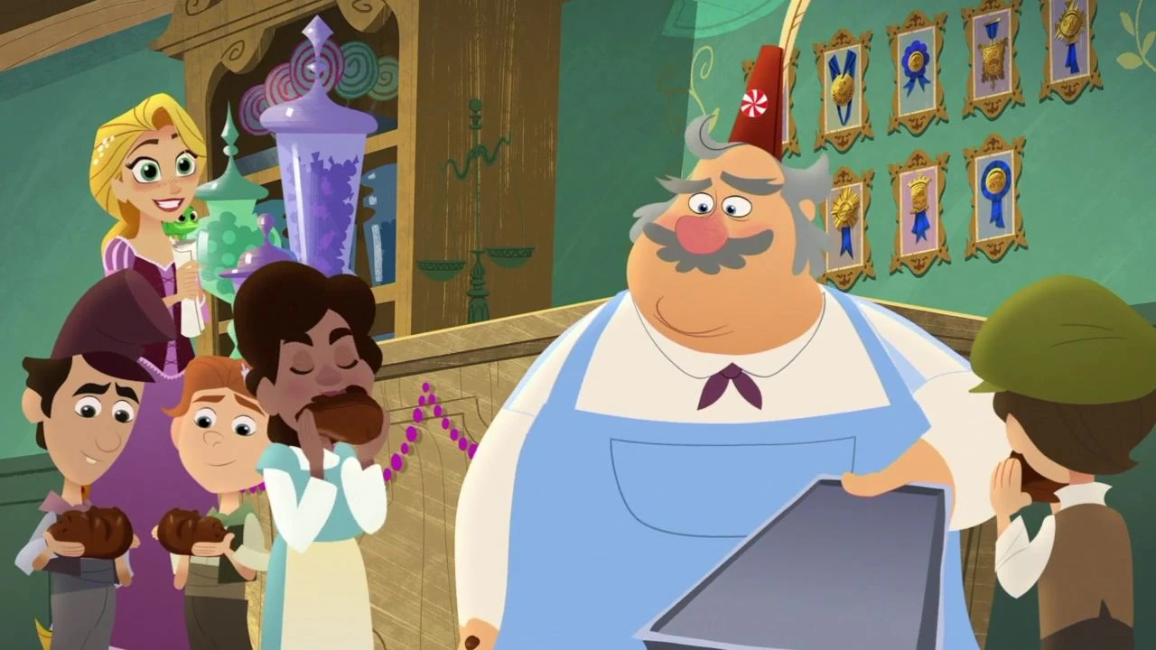 After that Eugene goes to Cassandra who is still busy with preparing the gopher for the festival. He doesn't understand why Rapunzel is so determined to win over her naysayer. Cassandra bluntly leaves him alone with the gopher to get something and after she leaves he starts eating the bim-berries which were supposed to be eaten by the gopher. Upon arriving in town she is at first surprised as she wonders why someone would like a Sweat shop owner as she realizes it is a sweet shop he owns. She steps in and sees Monty as he gives chocolate to the children, noticing the gopher grab seals on the wall. Eventually, she approaches him and tries to be friendly to him but Monty refuses to be nice to her even purposely giving her candy which was lying on the floor. As Rapunzel tries to clear the situation he accuses her of trying to throw him into the dungeon for booing her at the ceremony and makes her go out brokenhearted and more determined than ever to win him over.