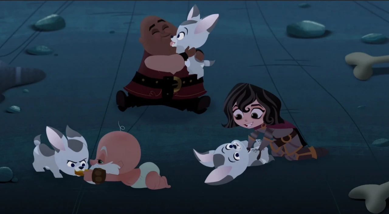 Eventually, the team found the magic top but end up in a room with three vicious dogs when the kids rode a wagon there. When the kids come too close to the sleeping dogs, Rapunzel tries to convince Cassandra to listen to her with a sweet attitude but when that didn't work, she took a more assertive approach and commands her to follow her. Meanwhile, Eugene tries to tell Lance to leave with him but soon understood that Lance just wants to be heard and listens to him and convince him to play chase. However, baby Shorty pulled a toy duck out of one of the dogs' mouth, waking them up and attempts to attack them. Using her quick thinking, Rapunzel used the magic top to change the dogs into puppies. Then she uses the top to turn her friends back into adults.